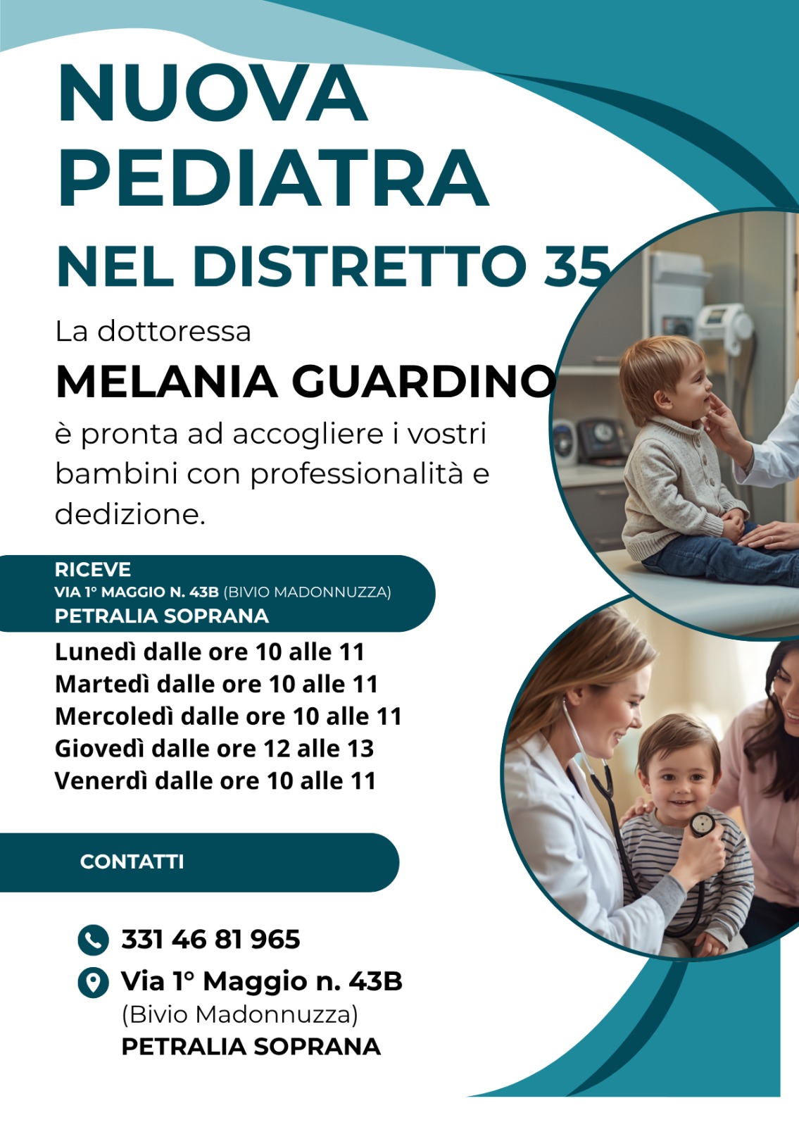 La nuova pediatra del Distretto 35, dott.ssa Melania Guardino, riceverà i suoi piccoli pazienti nello studio sito in Via 1° Maggio, 43/B (Bivio Madonnuzza) a Petralia Soprana con i seguenti orari: